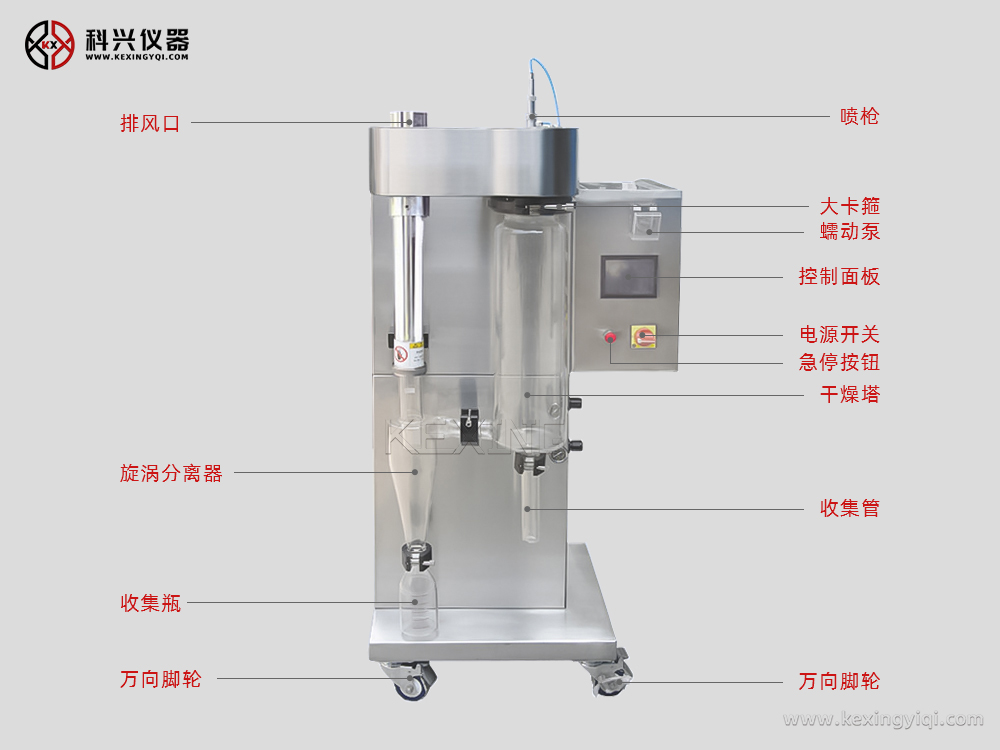 整機全不銹鋼制作;二流體噴霧的霧化結構,噴霧、烘干及收集系統采用透明的優質高硼硅耐熱玻璃材料制造